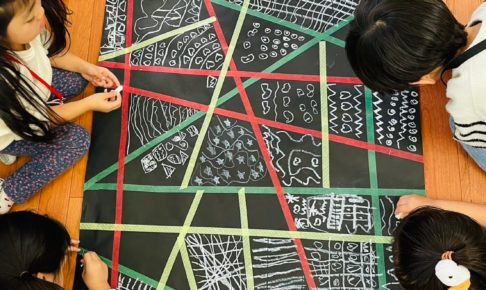 今日のArt time のテーマはBlack & White 黒い模造紙に幾何学的にマスキングテープを貼りました。 子ども達は白いクレヨンで自分たちが好きな模様を描いていきました! 子ども達は夢中になって様々なP…