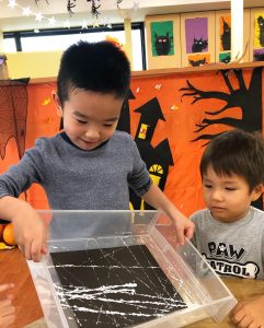 We enjoyed rolling painted marble on a construction paper. It made a great spiderweb to our spooky craft collection at Pegasus International School. It was tricky controls rolling the marbles by tilting the box. Well done!