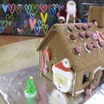 The older crafters learned how to paint a gingerbread house during art time. To give their houses a winter wonderland look, they used white paint and painted the outline of the brown paper houses. They also decorated their houses with colorful buttons, pompons, straws, and fancy ribbons. The colorful buttons and pompons look like gumdrops! Yum! The older children had a blast creating these cute gingerbread houses.