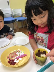 みんなが楽しみにしていたクッキングはfrozen banana をチョコレートにディップしてスプリンクルをかけて食べました。