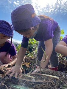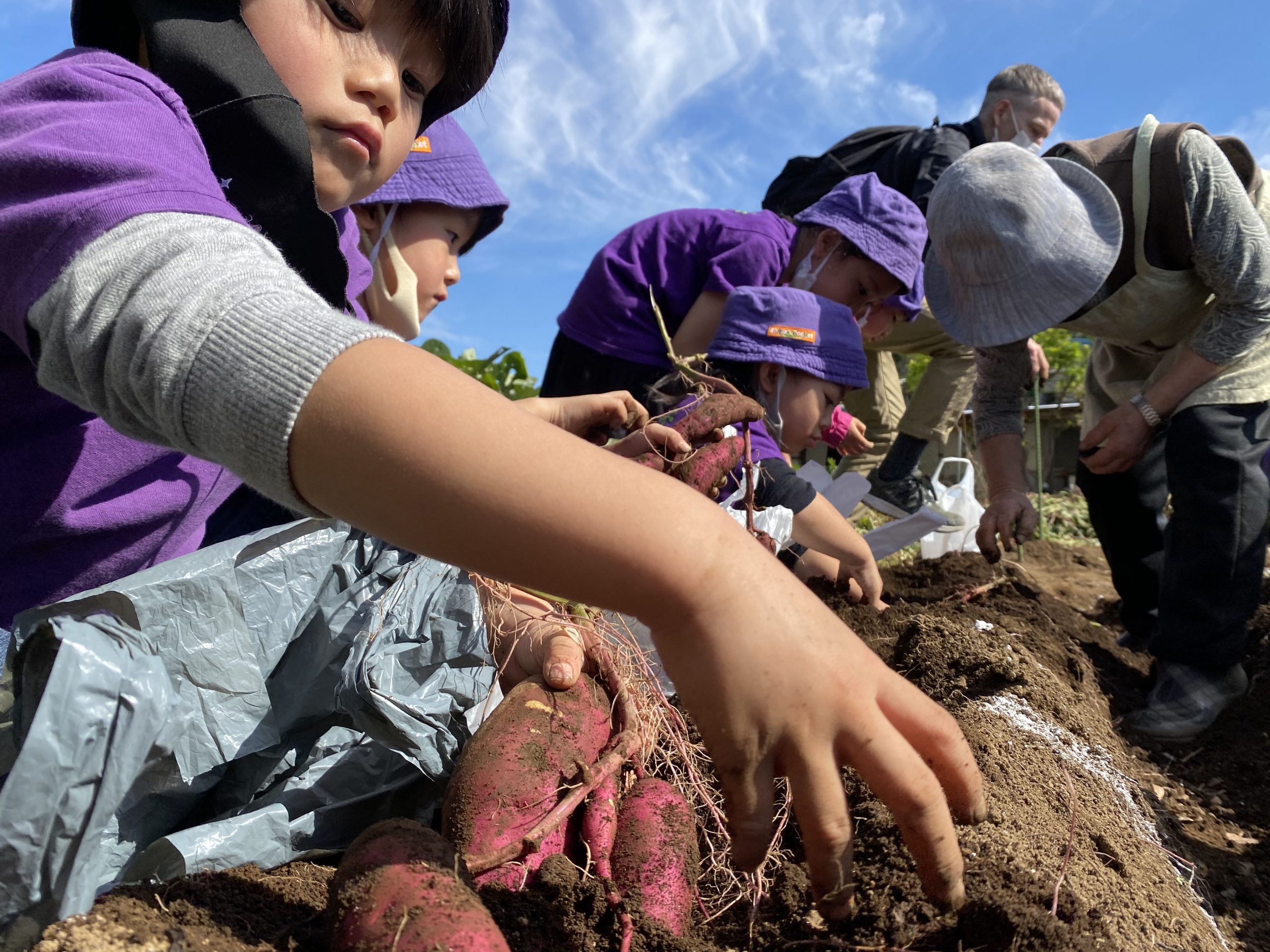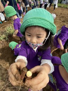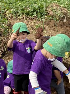 We went sweet potato picking! The weather was beautiful and children enjoyed digging for sweet potatoes. They also enjoyed having a picnic at a nearby park and playing there.