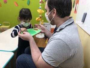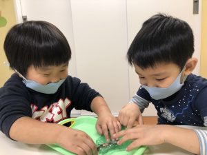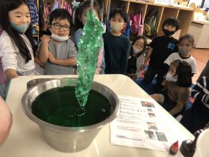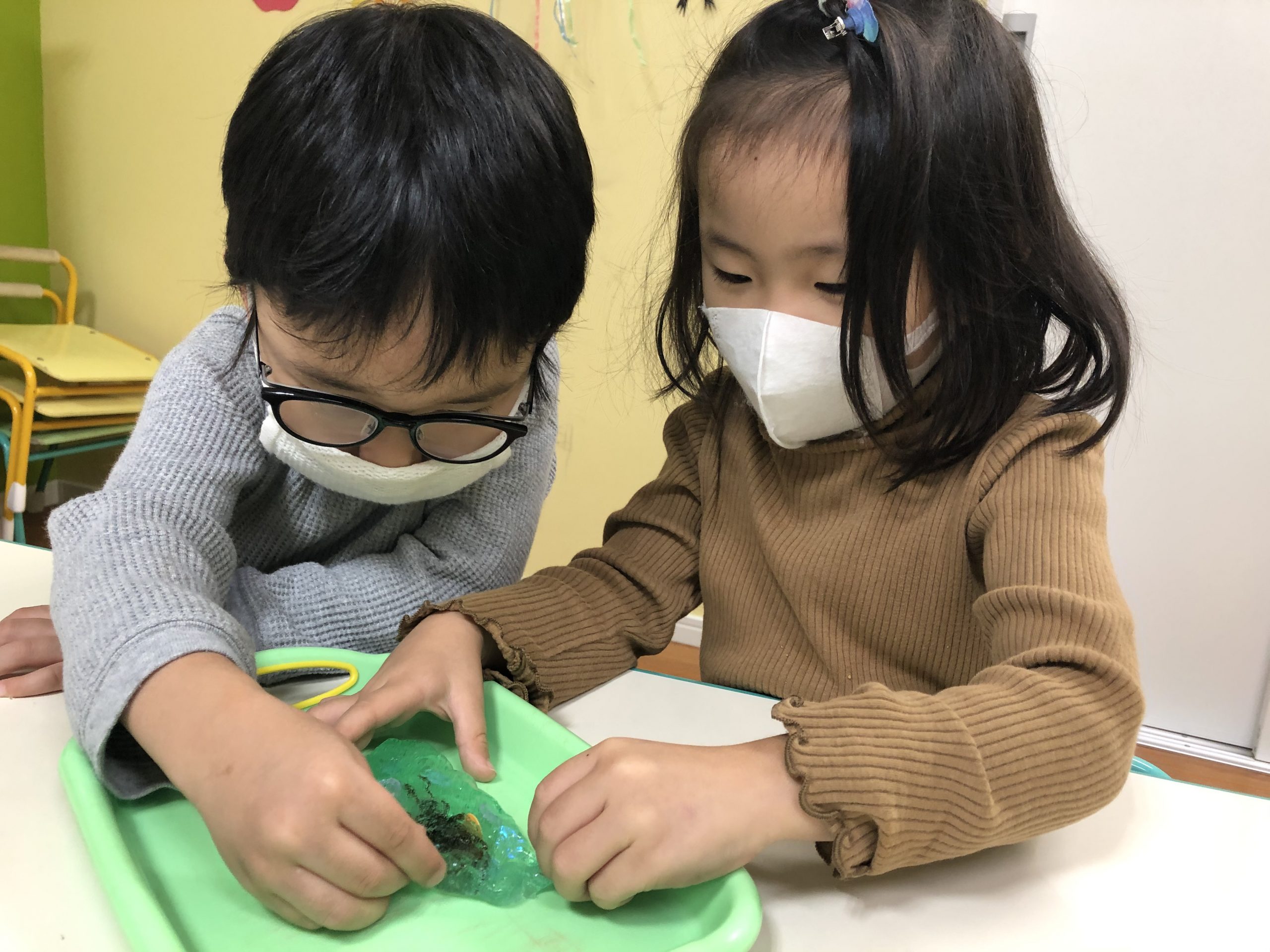Today we made creepy slime! Everyone was scared and super excited to touch it! We put Halloween glitters and plastic insects to make it creepy and fun!