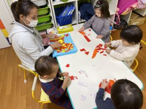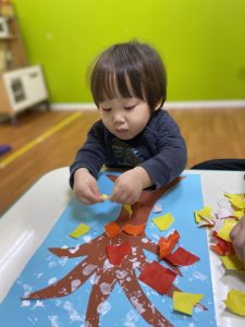今日のTwinkle Class(P1クラス)はモータースキルを上げるため紙を切る練習をしました。簡単なようにみえますがこの年齢には難しい作業です。そして糊をつけて1つずつちぎった紙を貼り素敵なA fall tree craftの完成です。