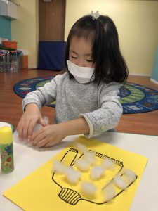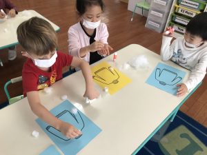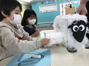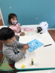 We learned that we get wool from sheep skin to make our warm sweater! The children were super excited to pull the wool off the sheep and gluing them onto their printed sweater to make a wool sweater. Everyone did a great job making a fluffy warm looking sweater!