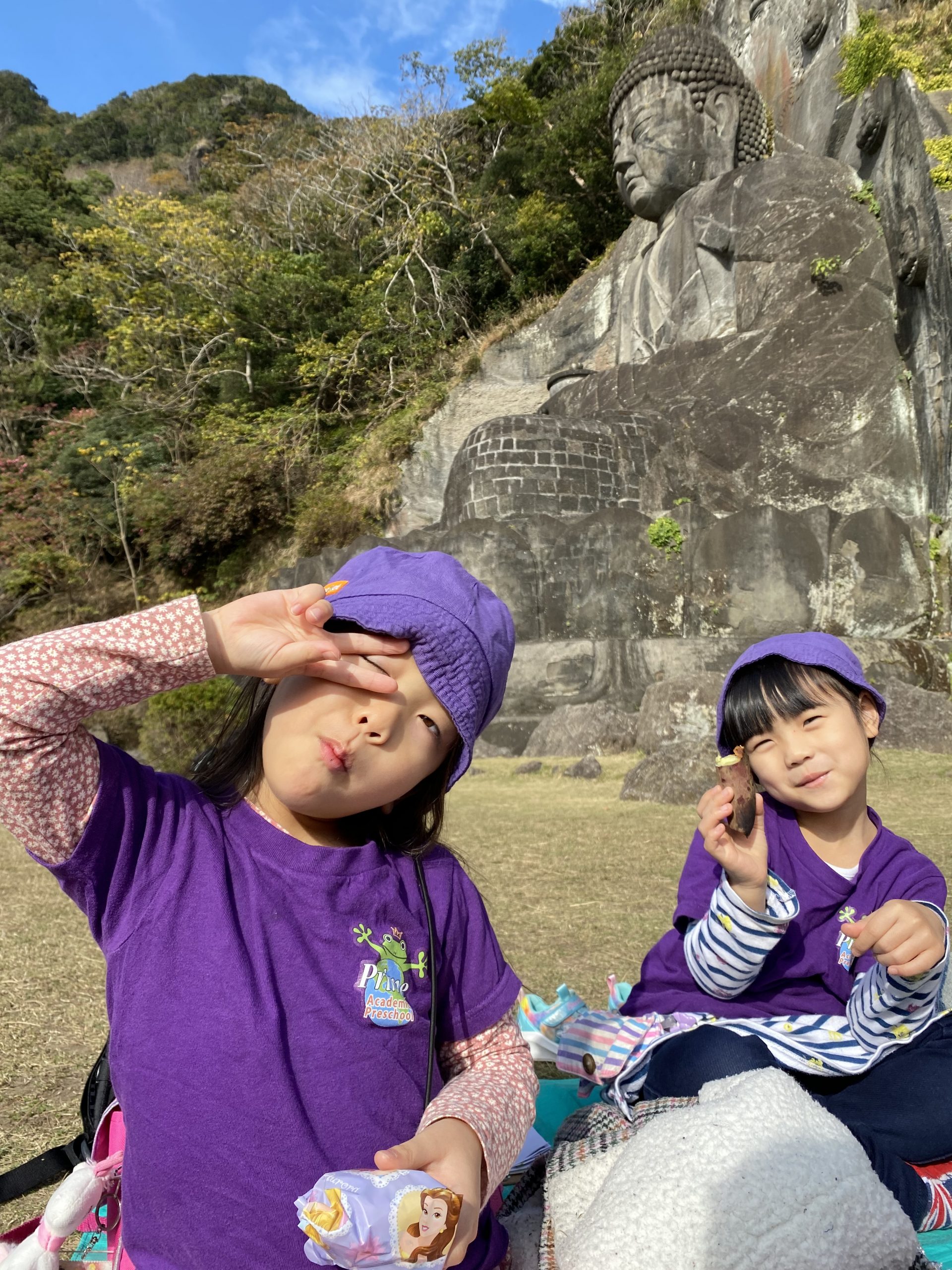 Today is the last day of November and we finished this month with a great fieldtrip to Nokogiri Mountain! The children had lots of fun singing and doing “I Spy” game on the bus and once they got there, we went to see the big Buddha at Nihonji (日本寺) Children were amazed at how big the buddha was!