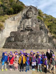 Today is the last day of November and we finished this month with a great fieldtrip to Nokogiri Mountain! The children had lots of fun singing and doing “I Spy” game on the bus and once they got there, we went to see the big Buddha at Nihonji (日本寺) Children were amazed at how big the buddha was!