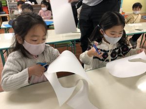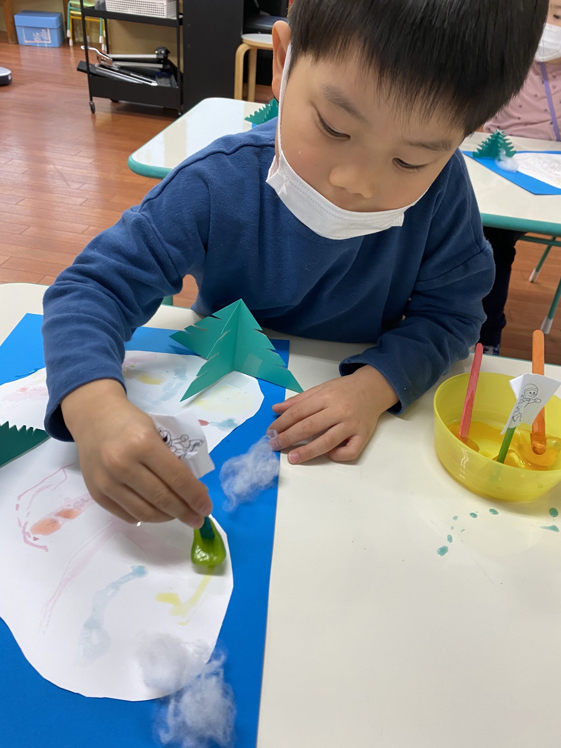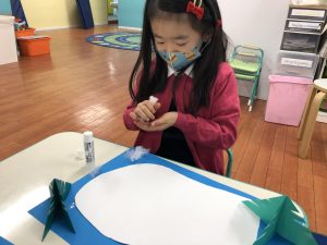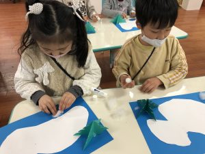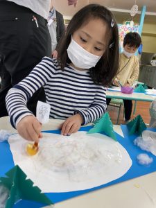 In the winter ponds and lakes becomes frozen turning it into a natural ice skating rink! We made our natural ice skating rink by using cottons for snow, folding origami papers for trees, and cutting our a shape for our skating rink. Then using colored ice, they skated the ice on their skating rink and left colorful lines. It came our beautiful! Well done everyone!