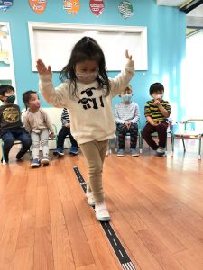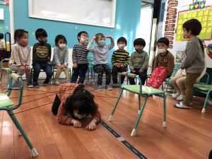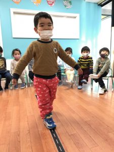 ロープの上を落ちないようにするテストを行い、