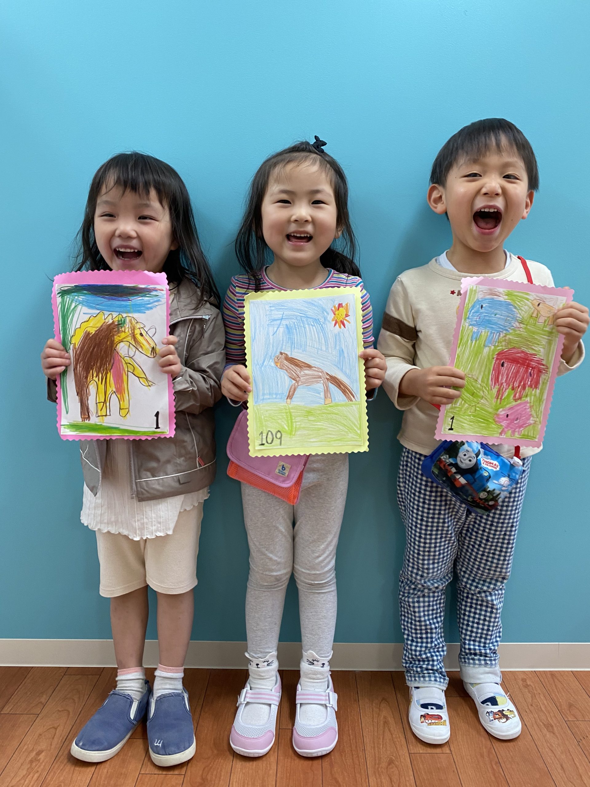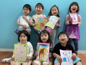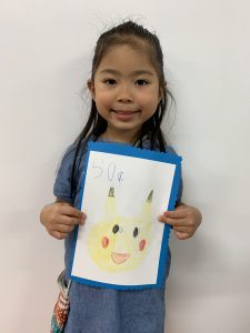 生徒が好きなものについて話し自分の好きなものを切手に描きオリジナルの切手を作りました。