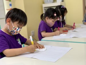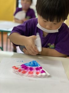 午後からは紙に水性ペンでデザインしタイダイバタフライを作りました!色鮮やかに仕上がり子ども達のお気に入りになりましたよ!