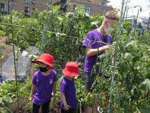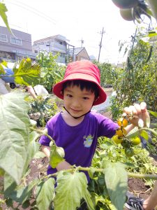 あっという間に畑へ到着!1ヶ月ほど前に植えたトマトやきゅうりなどの苗が子ども達の背を越す高さに成長していました!