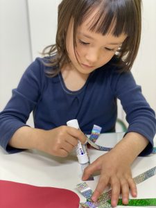 First, we need to glue some shiny paper to the red paper!
