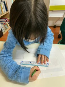 月曜のArtの時間ですが、定規使って何やら描いていますね。