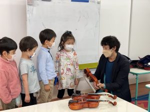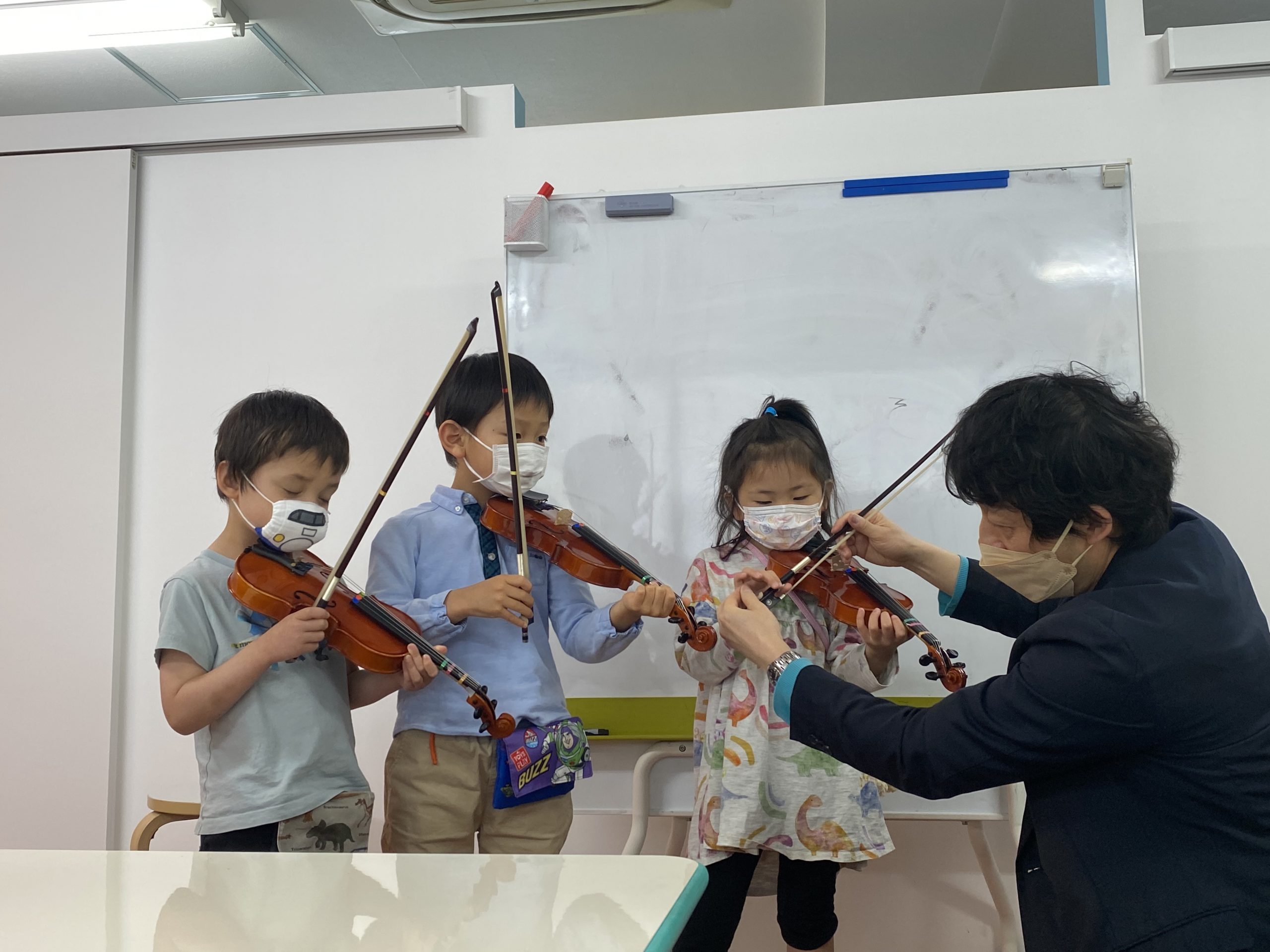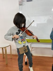 バイオリンの先生にご挨拶をした後、順番にバイオリンを持ってみました。初めて触れる子も多く、みんなドキドキでしたね。