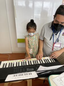 鍵盤に指を置いて、ド、レ、ミ、ファ、ソの5音を使って曲を弾いてみました。みんな指の番号をよく覚えていましたね!