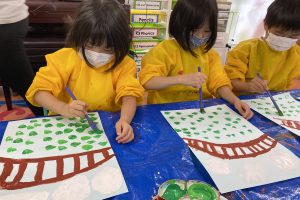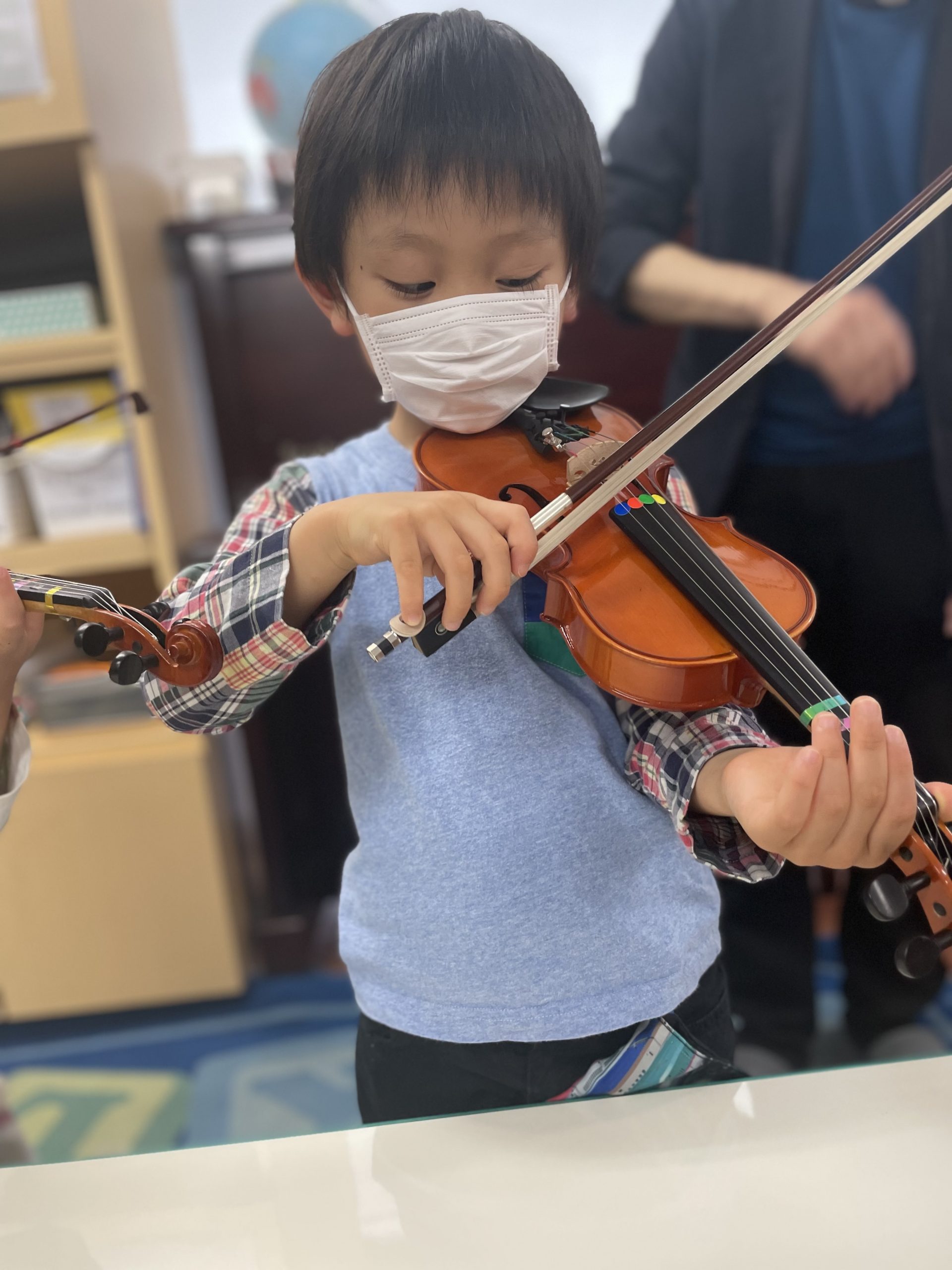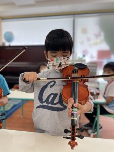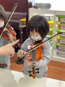 “Do you remember how to hold the violin?” と先週バイオリンの持ち方を習ったので、先生に聞かれていて、なんとなく?覚えている子も多かったですね。
