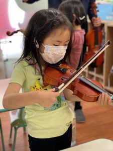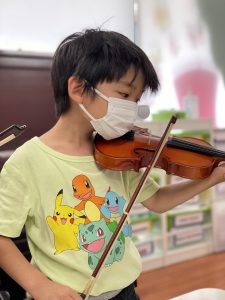 今日は左の指で弦を押さえる練習にトライです。指の番号を確認し、先生の言う通りに弾いてみると、一本の弦からいろいろな音が出るので、みんな喜んでいました。