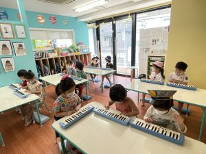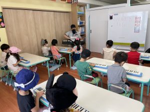 簡単な曲を合わせて弾いてみると、最初は、全部親指で弾いてしまう子や違う音を出している子などいました。しかし先生にチェックしてもらって、最後は皆上手に出来るようになりましたね!