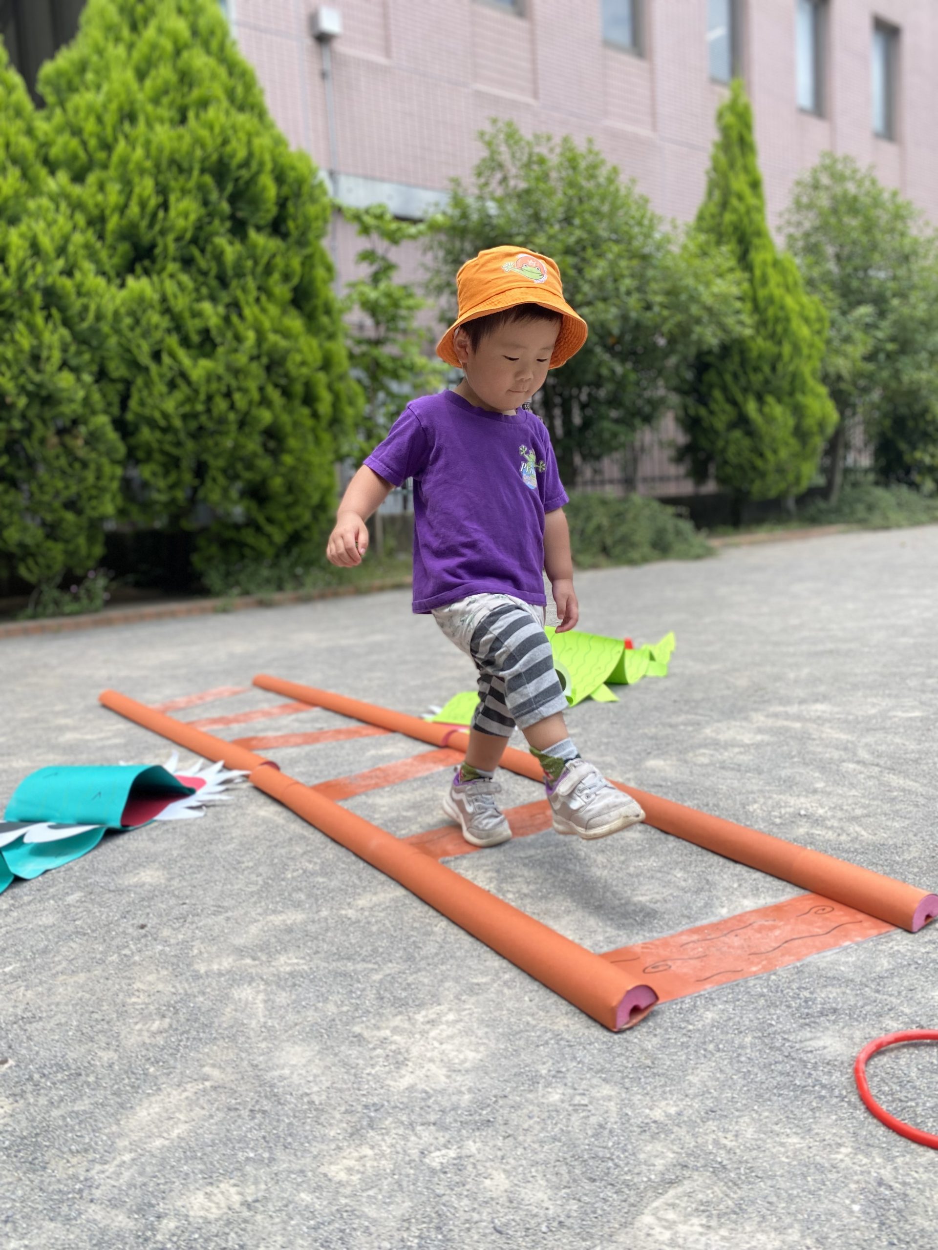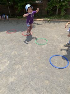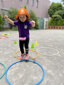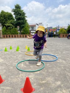 落ちたらワニがいる橋を渡り三角ポールやフープジャンプなど様々なコースをし盛り上がりました!