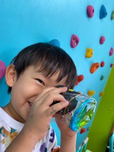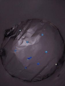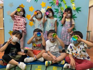 紙コップに夜空を貼り(アルミ箔)、★となる穴を開けました