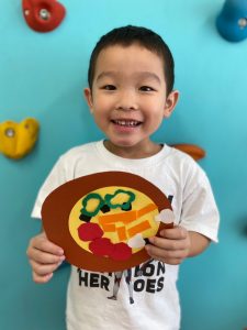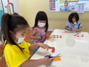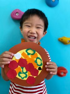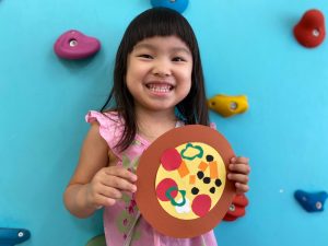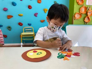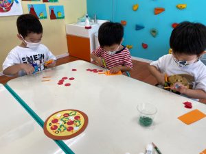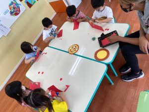 色画用紙を使ってサラミやピーマンなどPizzaに乗せる具材を作成しています