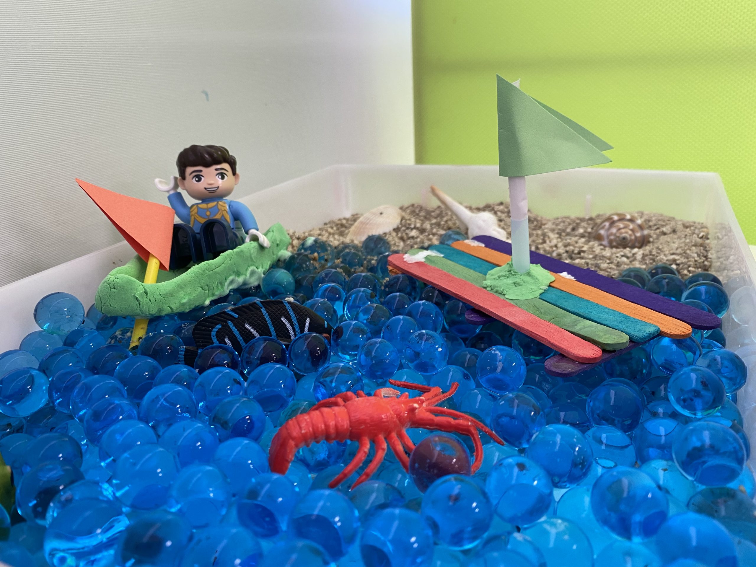 まずトレーに、本物の砂と海をイメージしたウォータービーズを入れます。