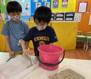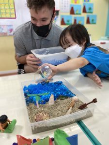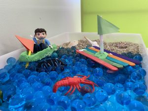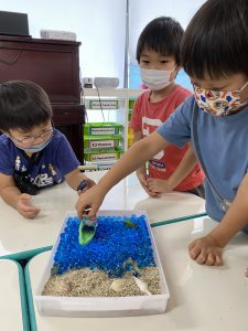 まずトレーに、本物の砂と海をイメージしたウォータービーズを入れます。