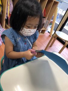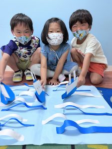 年少さんのクラスは丸い形を切るのに苦労したり、表と裏を逆に貼ってしまったりとアクシデントはありましたが、みんな最後まで一生懸命取り組んでいました!