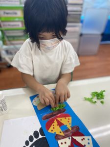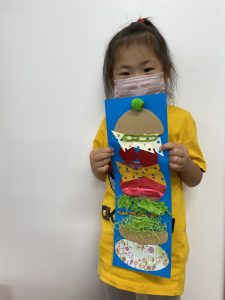 We used foam, origami paper, cardboard, felt, yarn, pasta and tissue paper. It was so exciting to stack our burgers high!