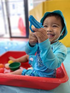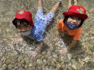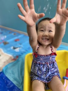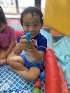 初の水遊びで、泣いてしまう子もいましたが、最後は沢山の水に触れて玩具で遊んでいました。