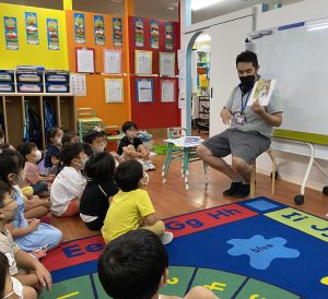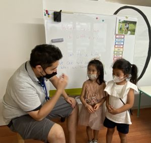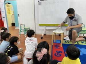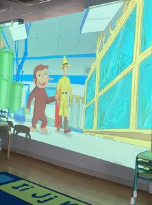 酸素など、空気にまつわる単語を勉強し、その後、動画で皆が知っている人気キャラクターと一緒に、人間と魚の呼吸の仕方の違いについて学びました。
