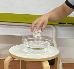 ビデオを観た後、コップにペーパータオルを詰め、水の入ったボウルの中に入れていきます。