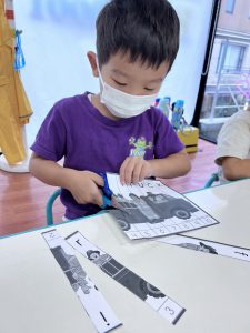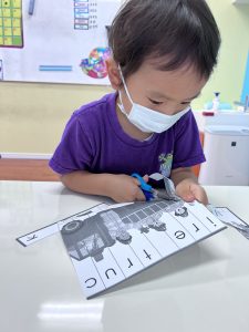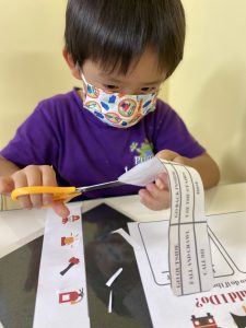 They had to put the strips of paper so that they spelled out “fire truck” with a picture of a fire engine.