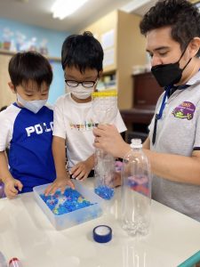 そして、ウォータービーズは同じ量を使い、大きいもの小さいもの、どちらが先に早く落ちるかという実験を行いました。