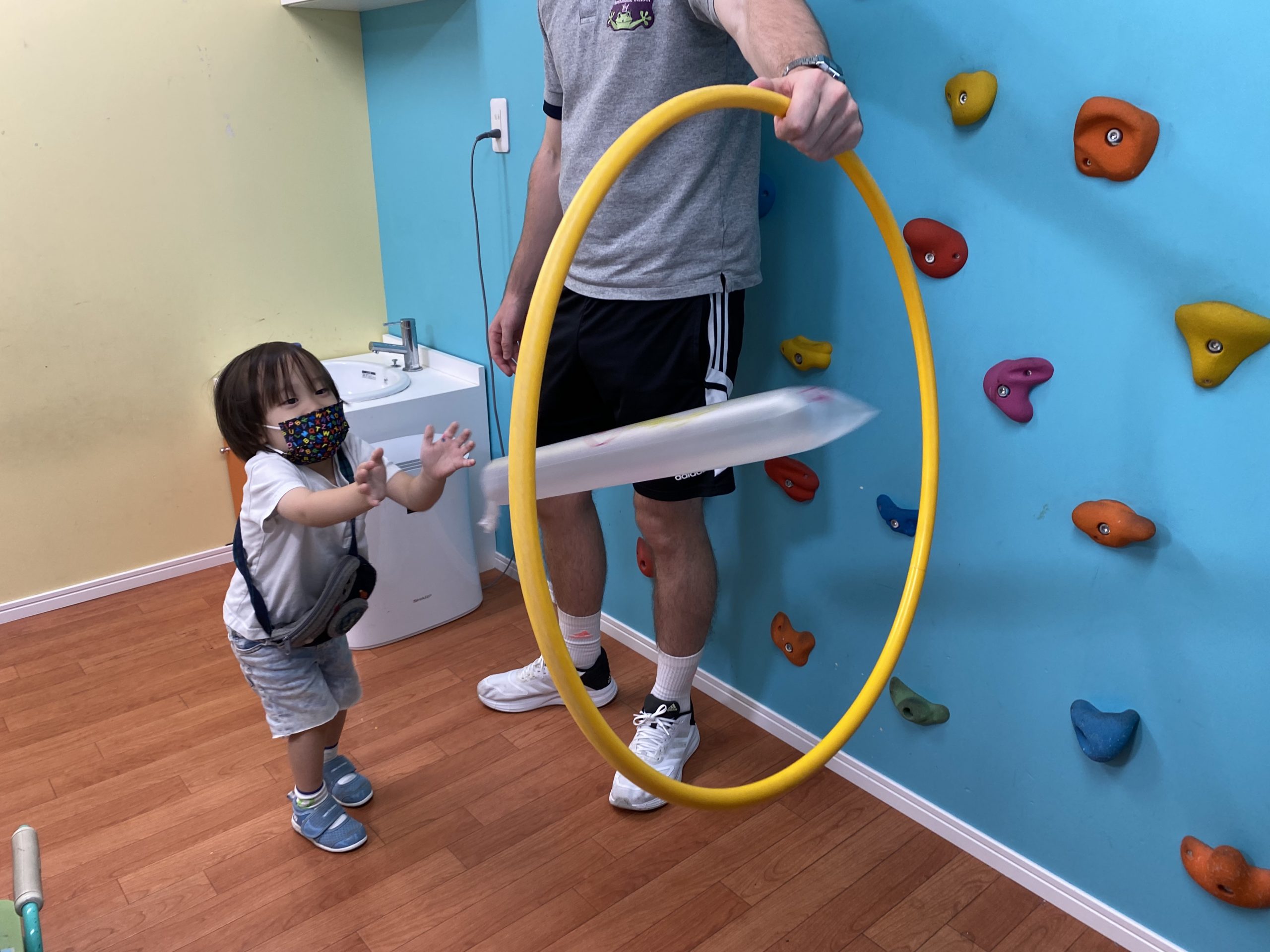 最後はロケットを飛ばしてみました。うまくフラフープを通るかな?!