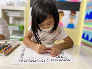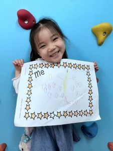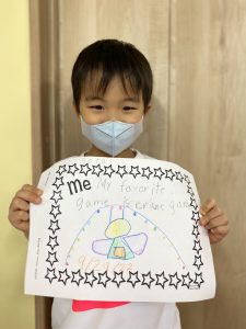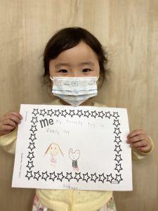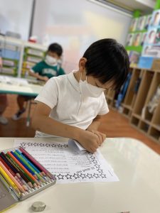 自分の好きなものは何かセンテンスを書いたり、好きな絵を描いたりしました。