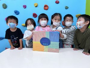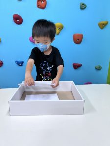 年少さんのクラスでは、箱に薄い紙を貼ってオリジナルのBOXを作りました。