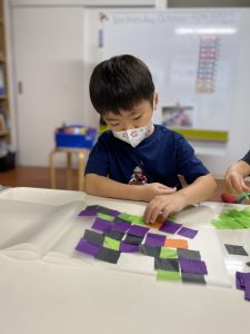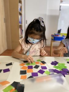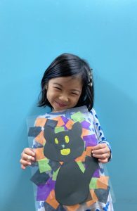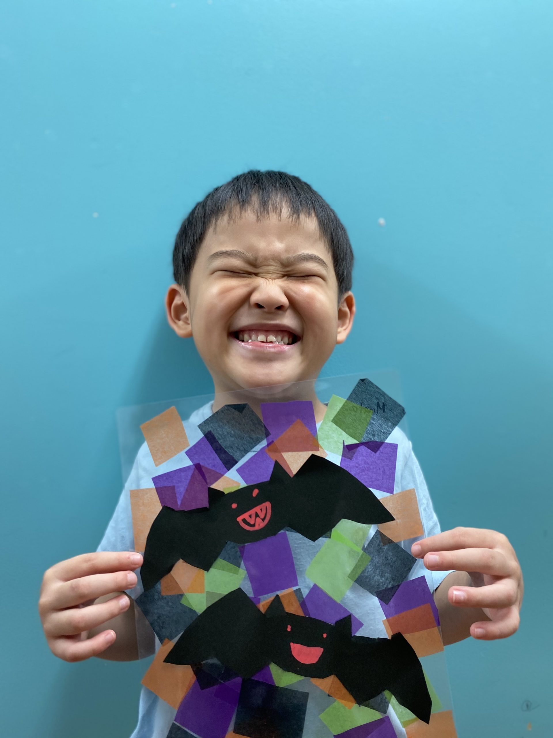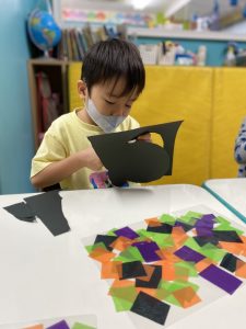 They started with arranging small squares of tissue paper that were Halloween color on a lamination sheet to create a beautiful pattern.