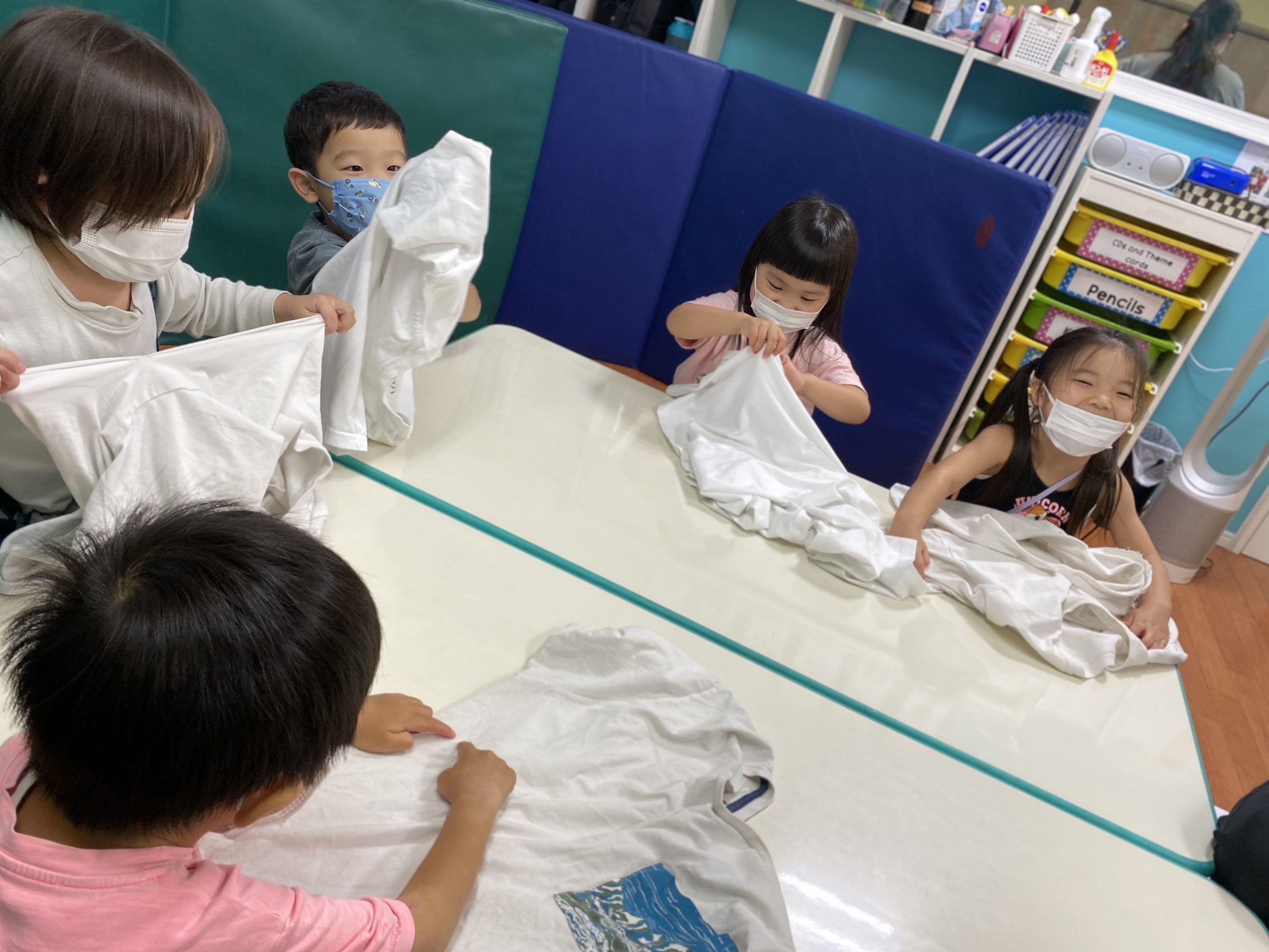 今日はみんなお家から持ってきたTシャツを裂きました。