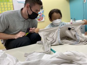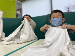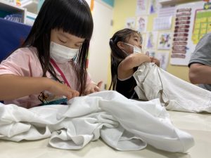 今日はみんなお家から持ってきたTシャツを裂きました。