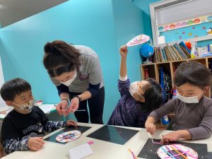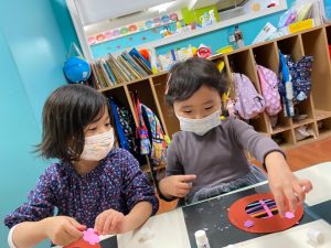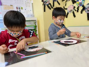年少さんのクラスではリングをクレヨンで塗りました