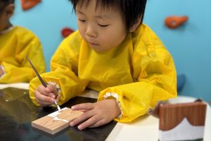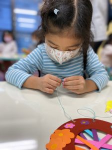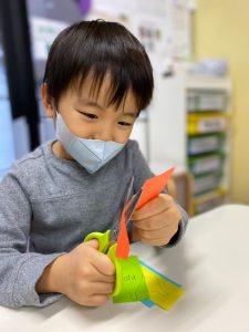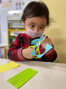 まずデコレーションの一部、紙製のフェザーを作るため、細かいカッティングの作業をしています。