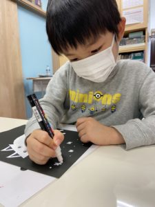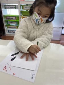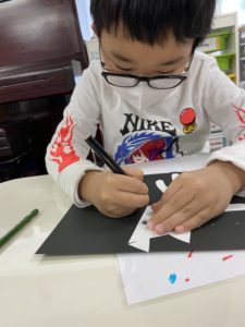 In art class today Galaxy class explored monochrome art. They had to make an art work using only black and white. The first step was to trace their hand on paper then cut it out by themselves.