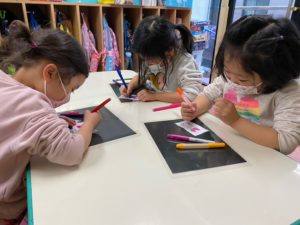 キラキラの下地のイラストを選び、サインペンなどでカラフルに色付けをしました。