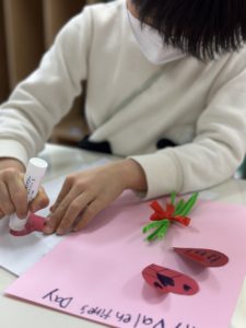 They started with decorating many red and pink hearts. They glued the hearts to the paper along with some green pipe cleaner flower stems.