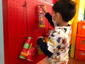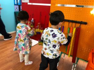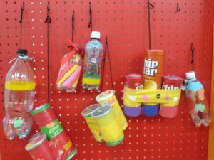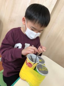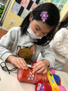 先週の続きで子どもたちはリサイクル品で楽器を作っています。