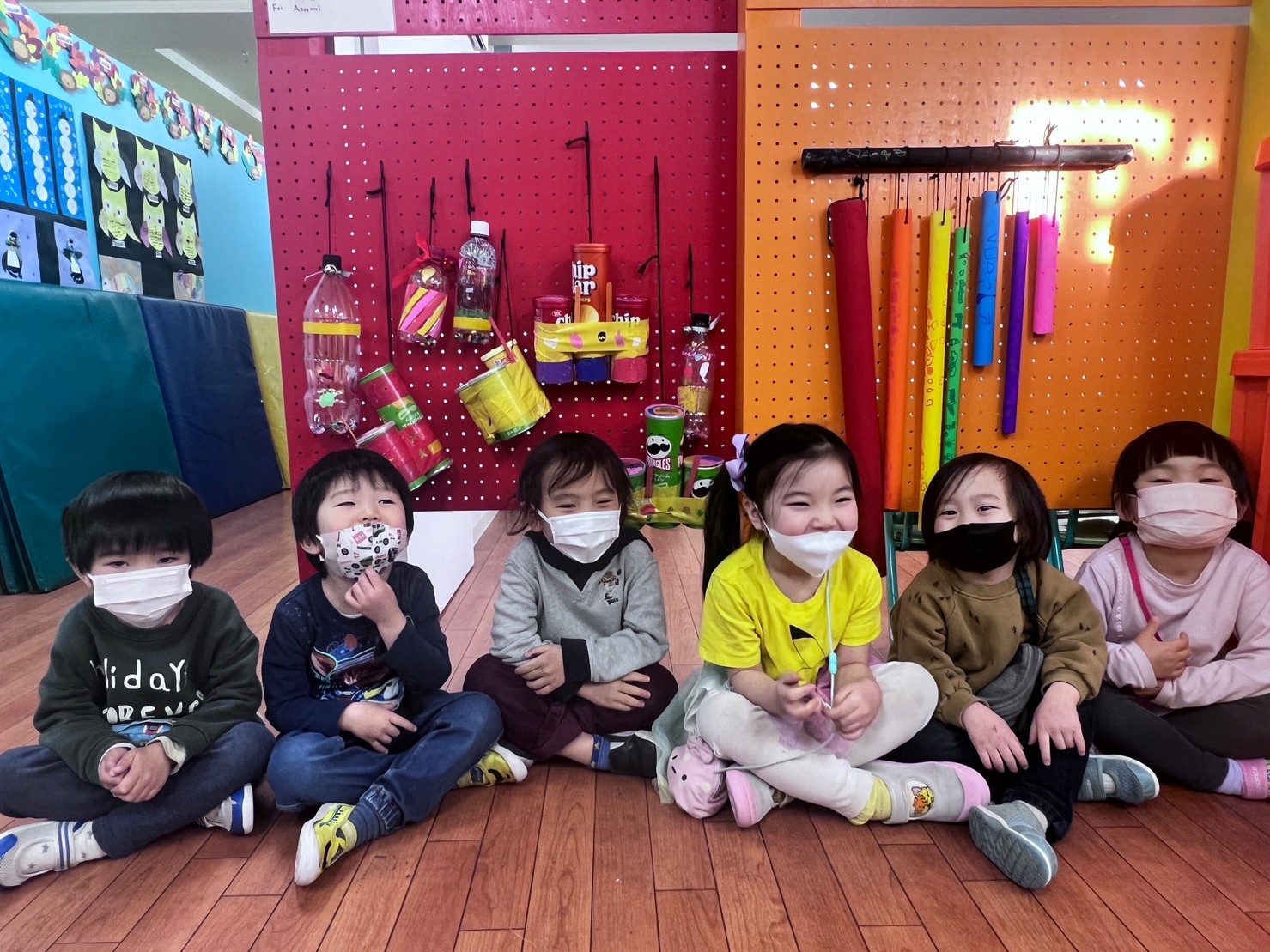 壁に自分たちが作った楽器を飾りました。