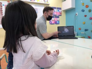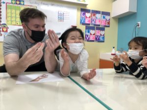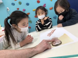 新しい単語を学んだ後に、先生と一緒にビデオを観ました。身体の一部を使ってどうやって音を出すのかな?!