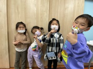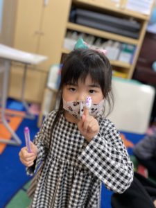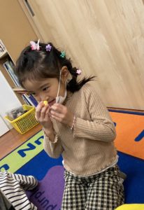 今日のアクティビティではこのまゆに水性ペンで動物や好きなキャラクターをカラーペンで描いてFinger puppetを作りました。