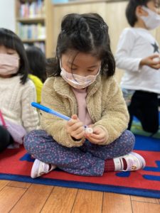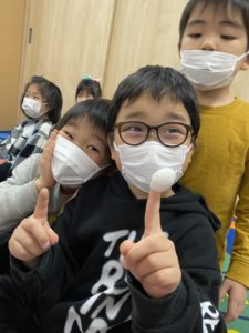 まゆを触ったり匂いをかいでstinky! と言ったり、逆に何の匂いもしないと発言する子もいて、様々な意見が挙がりました。